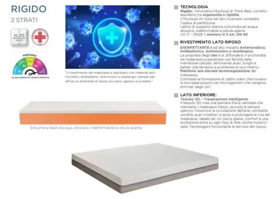 Al cuore del materasso c è una lastra di supporto in schiuma ad acqua atossica, alta 17 cm e con densità DN28: indeformabile, ecologica e a cellula aperta per garantire massima traspirabilità e durata nel tempo. Sopra, uno strato di memory foam Mycloud Air Soia da 3 cm (DN40) si adatta con precisione alle curve del corpo, offrendo un sostegno rigido ma non rigido, che mantiene l allineamento della colonna vertebrale senza creare punti di pressione.
