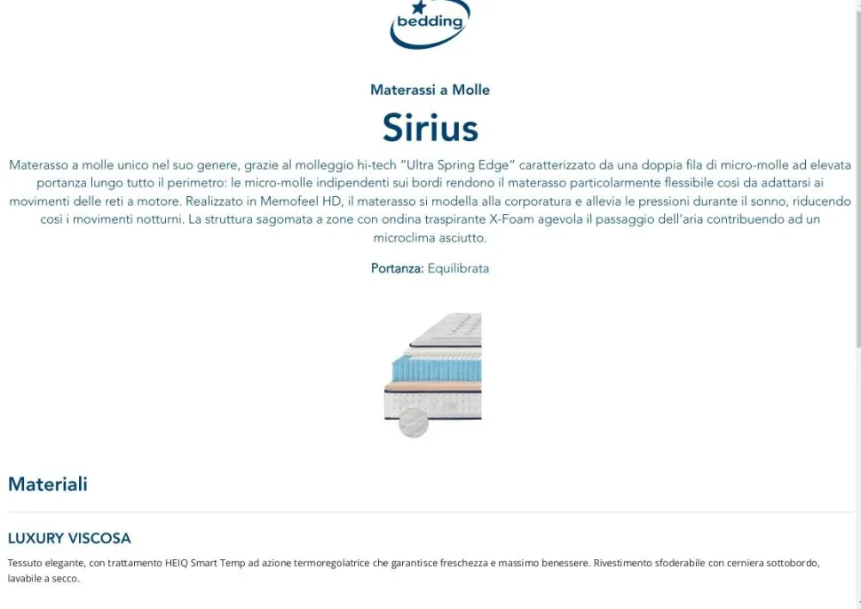 Quando cerchi un materasso niente è essenziale da valutare quanto il tipo di imbottitura: sono disponibili in commercio versioni a molle, molto resistenti nel tempo e compatte, a molle insacchettate, che consentono di creare zone di differente portata, in lattice, materiale estremamente morbido e anatomico, o in Memory Foam, sostanza morbida e capace di adattarsi alla perfezione alle forme del corpo; è tanto importante valutare attentamente le diverse tipologie per capire se questo materasso Sirius *, che è molle insacchettate, fa al caso tuo.