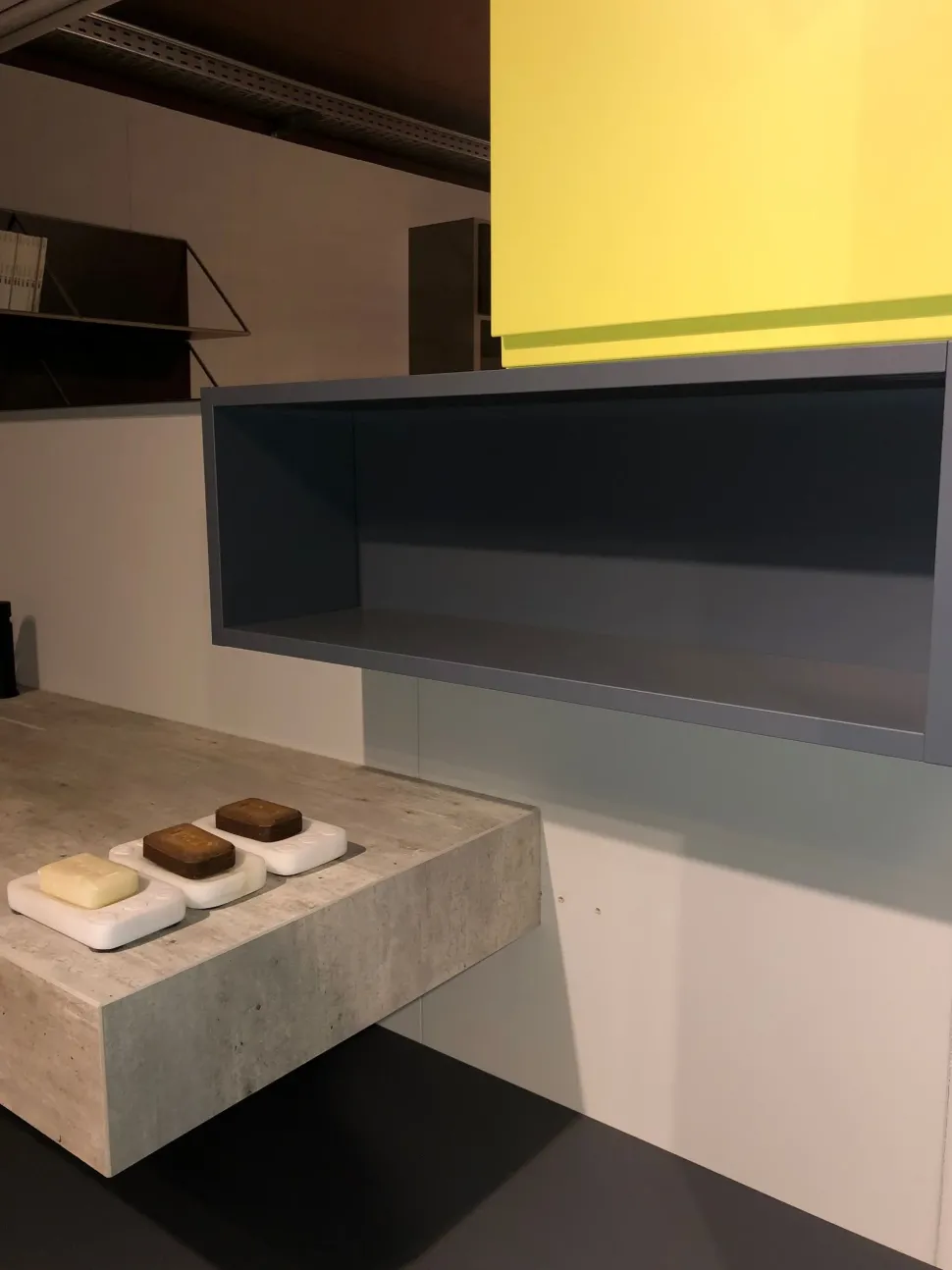 – Pensili laccati blu cobalto e giallo olio. Un abbinamento in palette per chi ama i contrasti e gli accostamenti di carattere.