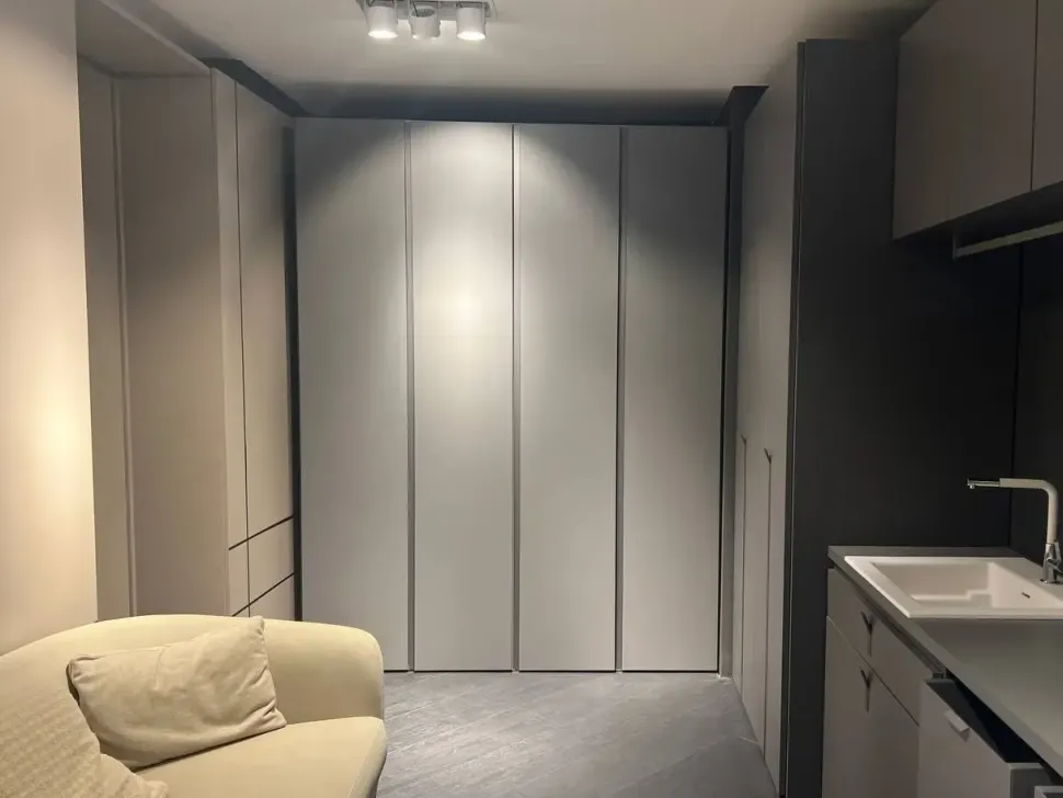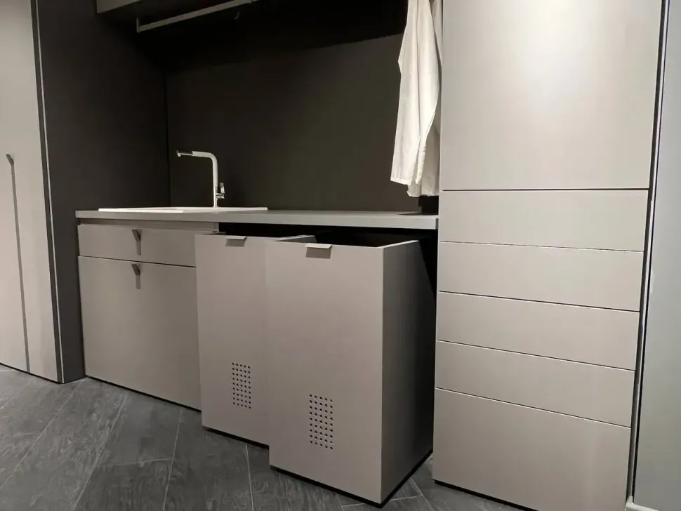 Formato da un modulo lavanderia con 2 ante battenti, top con lavabo, cassettiera con push pull, cassetto con ribalta e fuoriuscita del ferro da stiro. 2 moduli pensili con ante battenti, 2 contenitori con rotelle, un appendiabiti. Maniglie katy T in verticale.