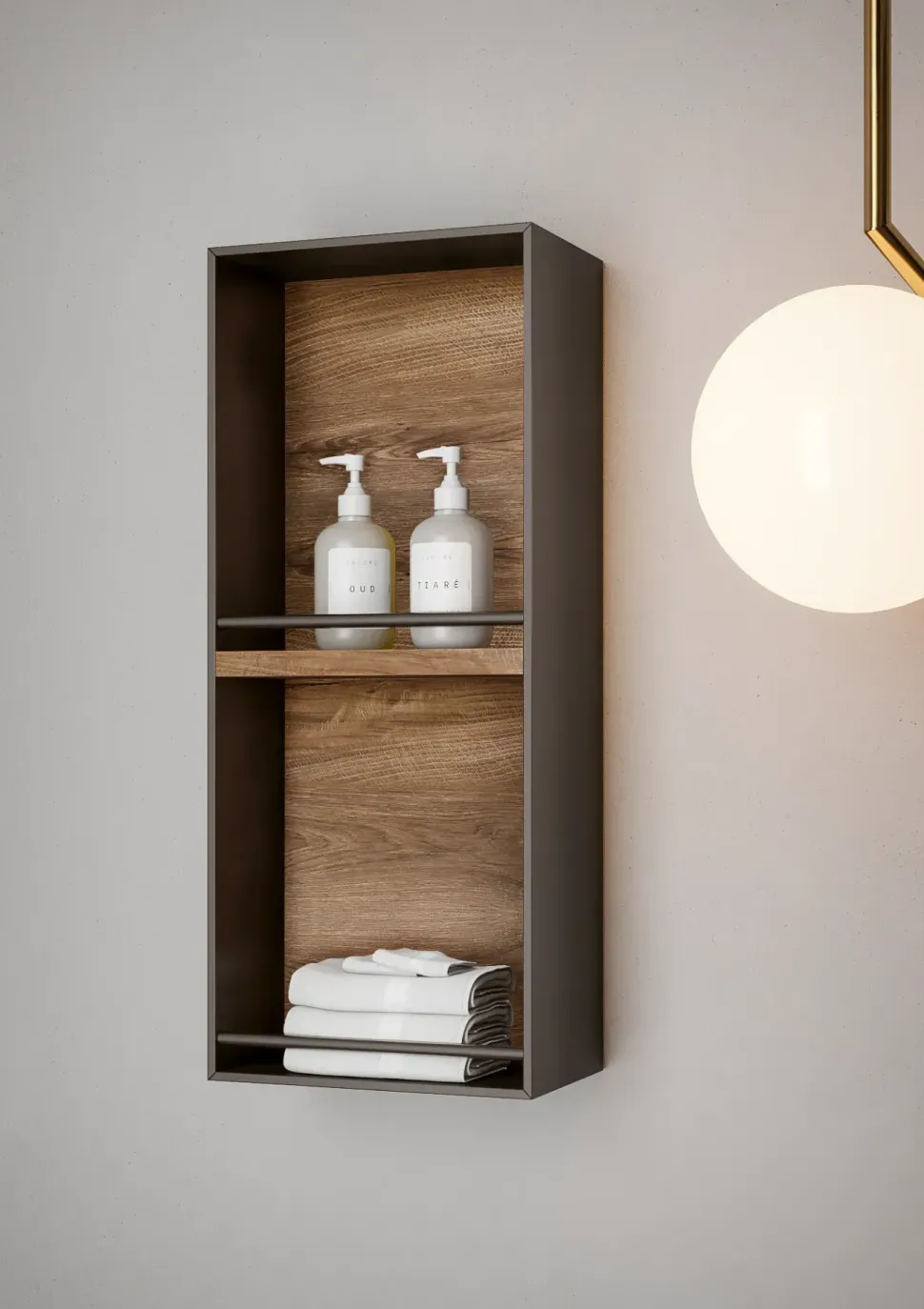 Il monoblocco è rifinito in Quercia Wild, una particolare sfumatura che si abbina alla mensola dello specchio mod.Mio, la stessa finitura scelta per il fondale del mobile pensile a giorno che presenta una struttura metallica color Moka. Il contrasto tra i toni caldi del legno si fa ricercato e moderno grazie alla finitura Lava del lavabo.