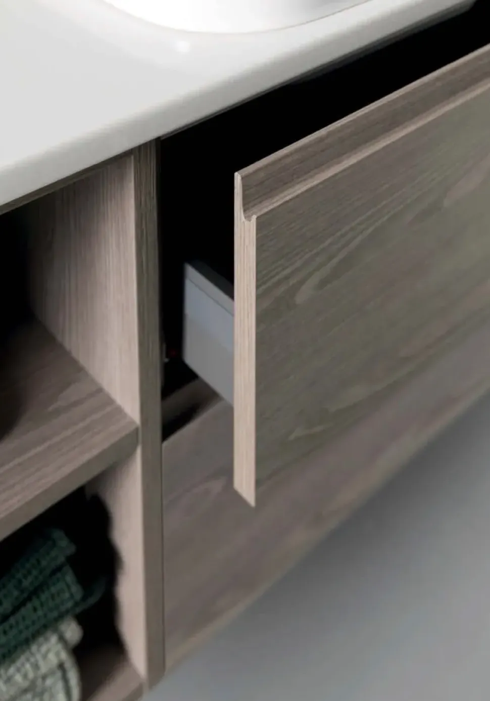 - Con il fine di poter far fronte a diverse problematiche abitative, il brand ha messo a punto una serie di arredi di varie tipologie per il bagno; il modello presente in foto è un mobile sospeso, plurifunzionale e ampio.