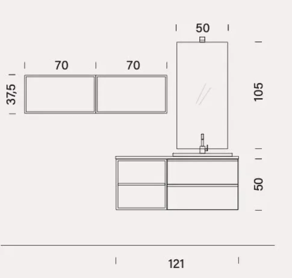 Dimensioni composizione: L 140+121 x P 20,8/46,5cm (vedi disegno).