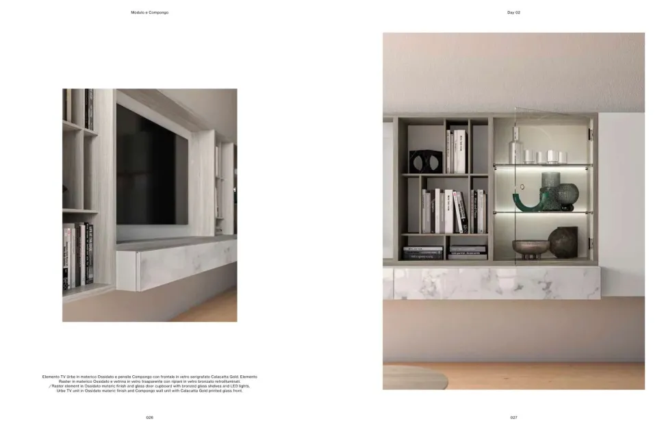Esempio di soggiorno Day 2 come da foto, in materico Ossidato frontale in vetro serigrafato Calacatta e vetrina in vetro trasparente con ripiani retroilluminati.