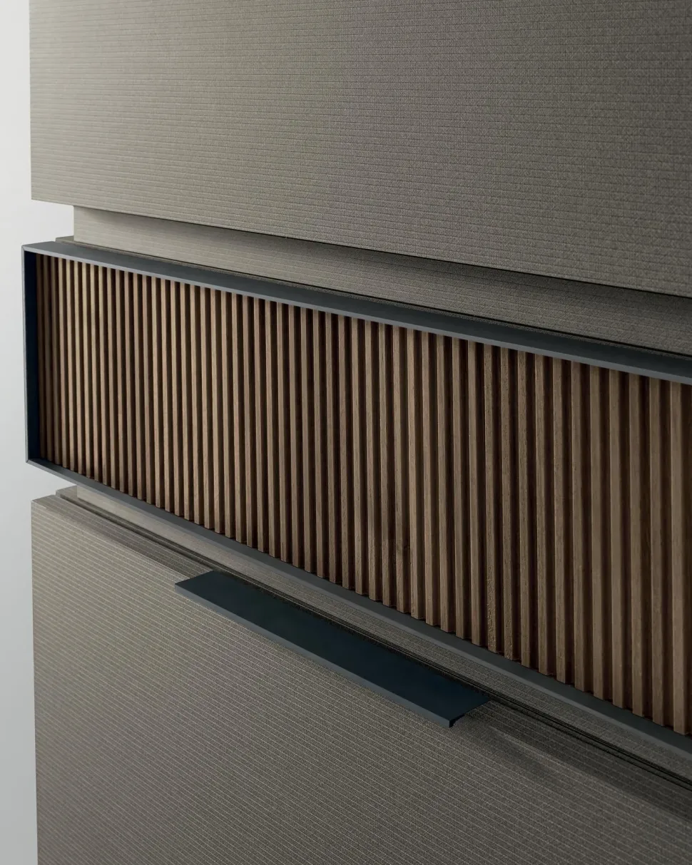 Finiture della foto: Materico paglia bronzo, materico opaco antracite, legno noce canettè e metallo antracite.