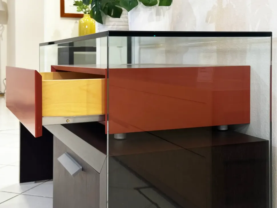 Il mobile da ingresso Alter Ego è dotato di panca con cestone su ruote laccati color wengé con cassetto, piedini e sopralzo in cristallo temperato. Specchio verticale con fascia inferiore legno wengé.