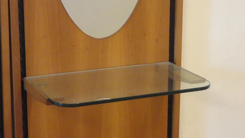 I ripiani sono in totale 3, 1 in vetro trasparente con angoli arrotondati e nella parte superiore abbiamo 2 ripiani in finitura noce.