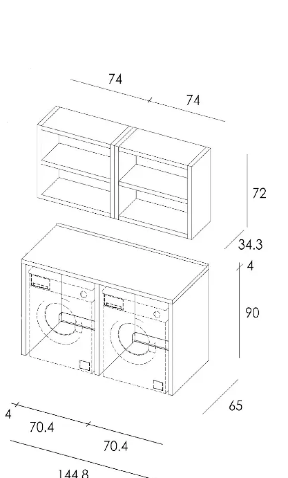 La composizione proposta prevede una base di contenimento elettrodomestici, lavatrice ed asciugatrice, che ha una profondità di 65cm. e larghezza 144,8cm.