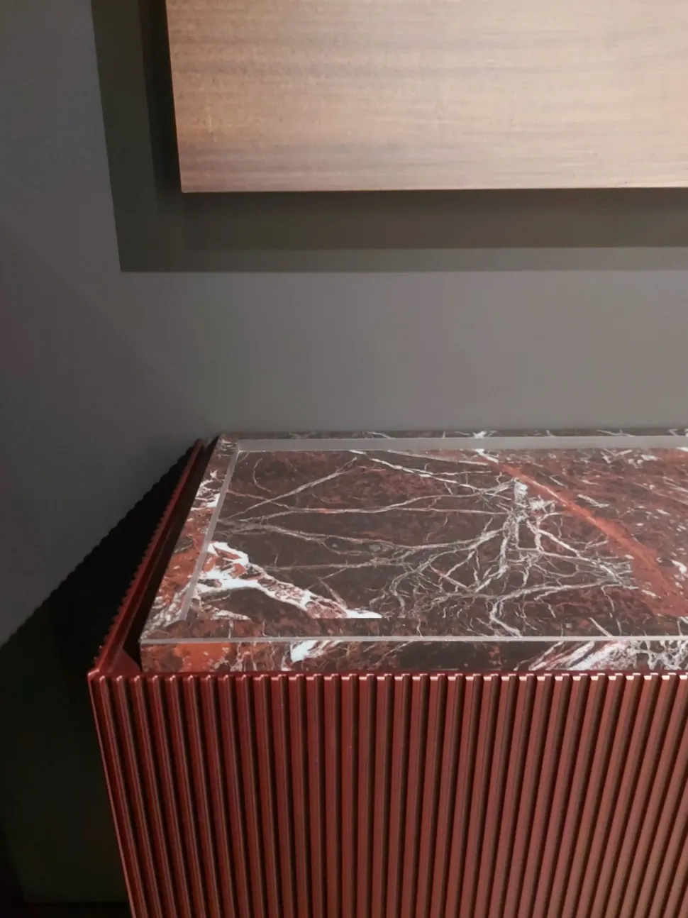 Parete Tv Living SOTTOCOSTO, in offerta per Rinnovo EXPO MOSTRA BINOVA ROMA PRENESTINA composta da boiserie in legno noce per TV (misura 180cm) + boiserie con mensole illuminate in colore in laccato Metallizzato Amaranto(misura 213cm). Nella parte inferiore è composta da base sospesa a 2 cassetti rivestita in pregiato gres ceramica Rosso Lepanto sia sul top che anche le ante sono in gres ceramico Si completa con altre 3 basi da 90cm cadauna in laccato Metallizzato colore Amaranto rigato cannettato con un top in gres ceramico Rosso Lepanto e salva goccia in rilievo. Parete Tv Attrezzata di assoluto pregio. Misura complessiva larghezza 393cm. NON SI EFFETTUA TRASPORTO E MONTAGGIO FUORI ROMA. Mobile visibile presso nostro store BINOVA .