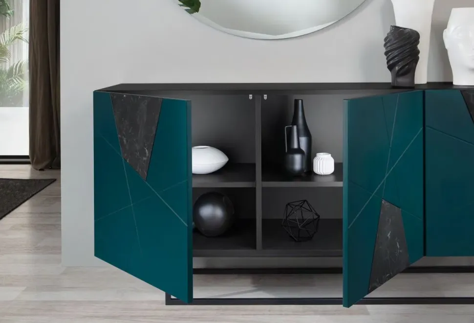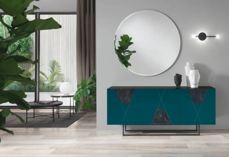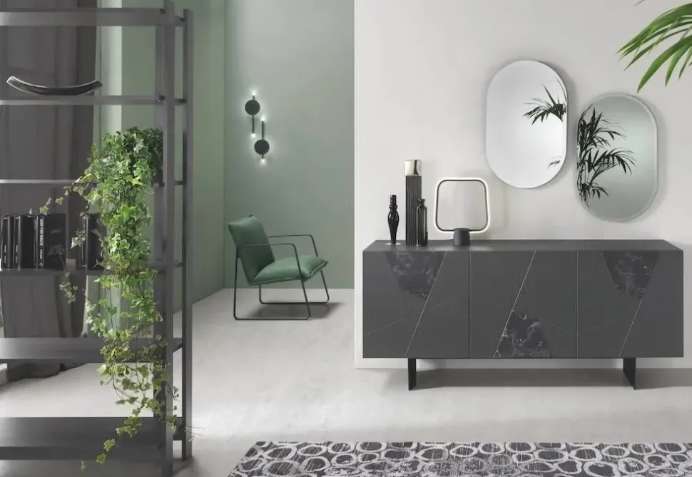 - Linee decise e materiali durevoli: scopri la madia in laminato materico qui visibile e potrai completare il soggiorno.
