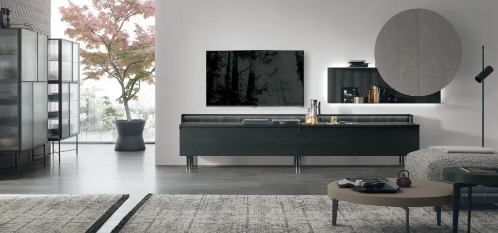 Per completare un soggiorno design opta per una parete attrezzata che mantenga una certa coerenza di stile, come questo modello Atlante unit at101 a prezzo scontato.