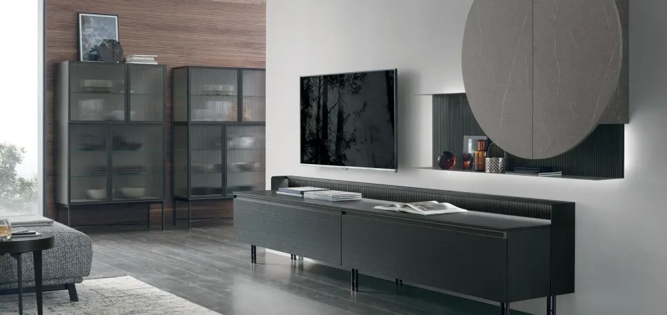 Un elemento distintivo rispetto alla linearità della composizione è il pensile DOT, realizzato in materico calce scura. Il suo design circolare, dietro cui si trova uno spazio contenitivo arricchisce il living con una modulo funzionale e decorativo che richiama la pienezza della luna, sia nella sua forma che nella matericità.