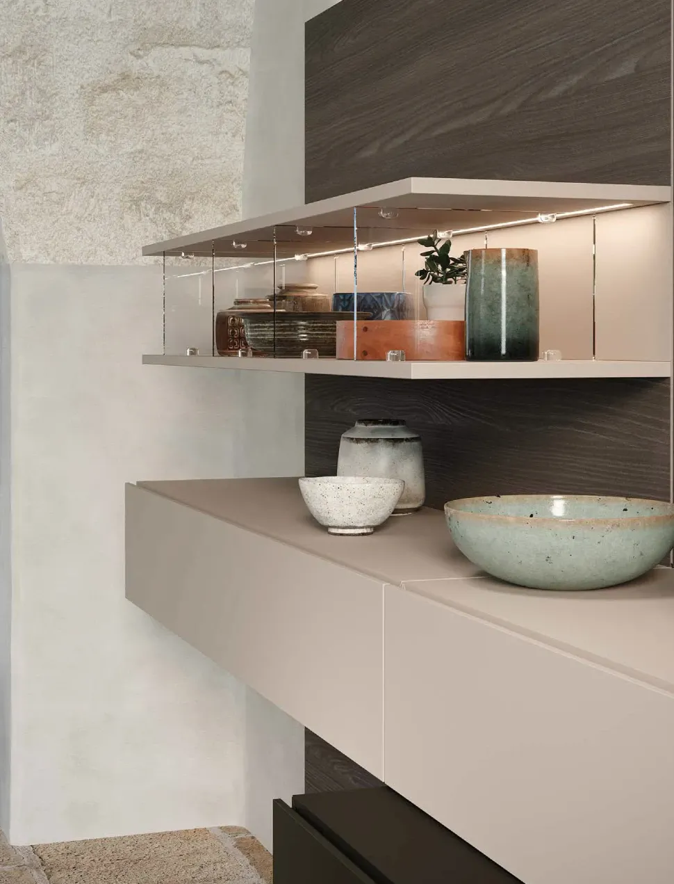 Composizione dinamica e moderna di produzione artigianale di alta qualità- La base sospesa, il cassettone e la mensola sono in finitura laccato opaco (sia fuori che internamente) e rispettivamente nei colori Moka e Cappuccino, mentre la Boiserie è in finitura materica Olmo Brown-