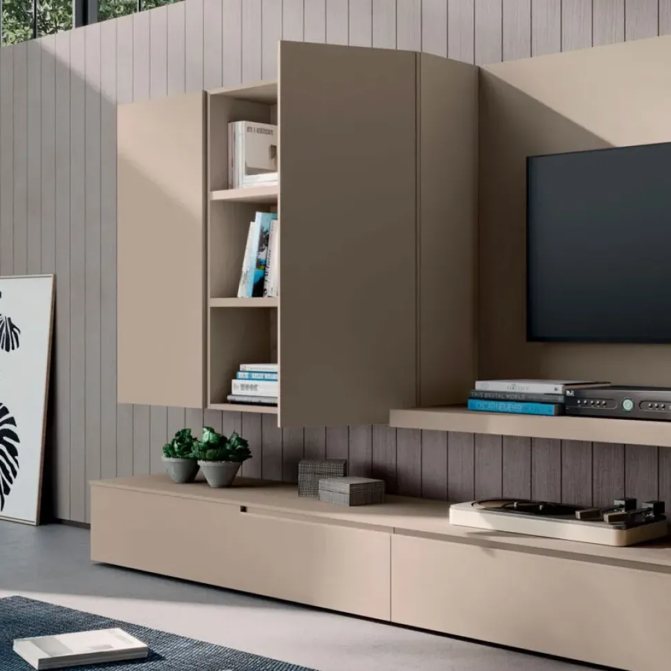 - La composizione per il living qui visibile è realizzata in materiali pregiati e resistenti nel tempo: questo modello, in particolare, è in laccato opaco.