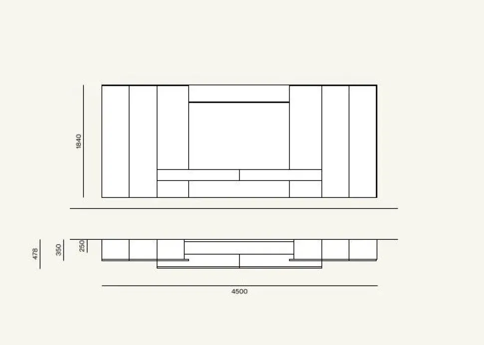 Esempio di soggiorno Day 19 al prezzo esposto come da foto, pensili in materico Seta, cassetti materico Carbone, boiserie in melaminico marmo Tunisi, Misura L.4500 H.1800 P.350/478.