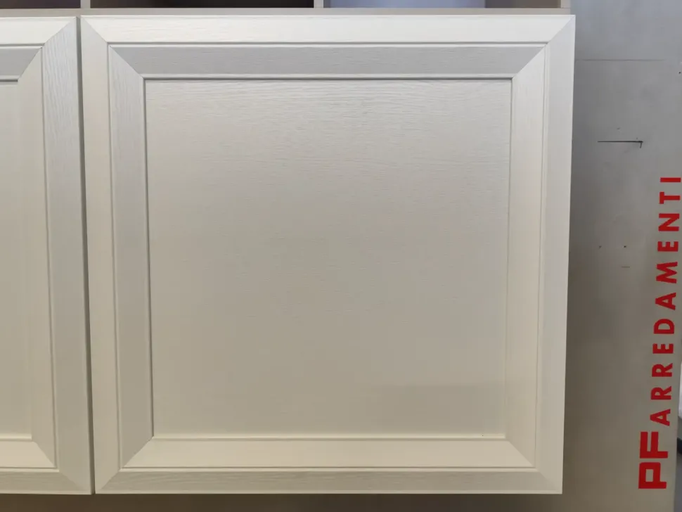 Basi ed elementi a giorno color canapa mentre i pensili sono bianco frassino.