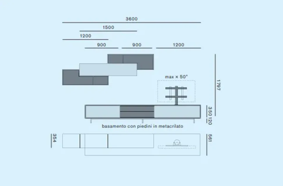 - I pezzi di arredo non devono mai essere d’ingombro nel living, per cui è fondamentale valutare con cura anche le misure: il modello visibile in foto ha una larghezza che va da 351 a 400 cm.