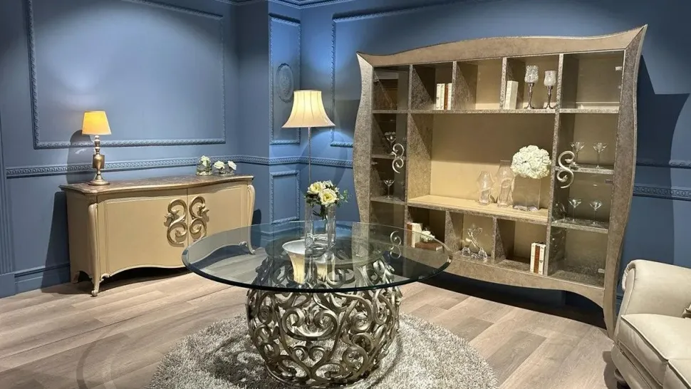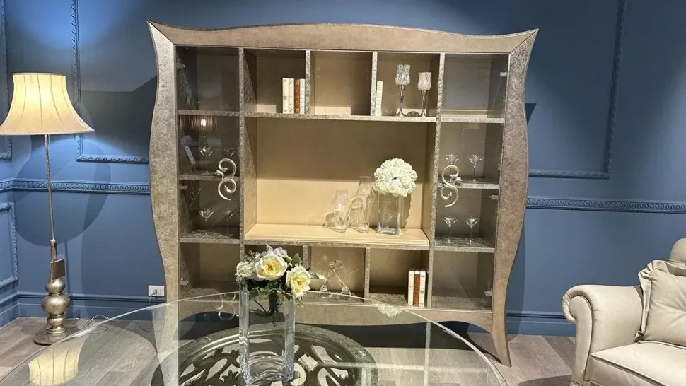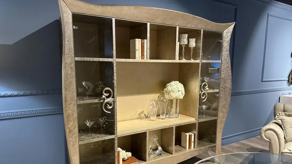 Disponibile all’interno dello Store di Cerignola (FG), parete libreria Liberty firmata Giusti Portos con ante vetro e maniglia Hera, tutta realizzata in finitura foglia oro tortora ed interno in laccato opaco nocciola dorato.