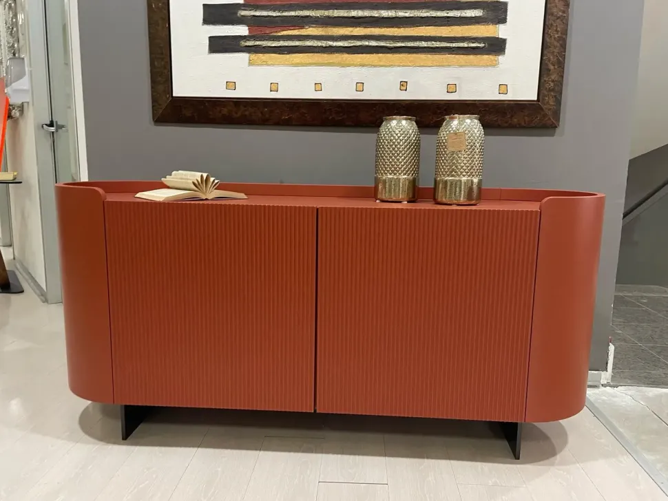 Madia con doppia anta grecata, tutta laccato opaco terra di siena, con piede in metallo.