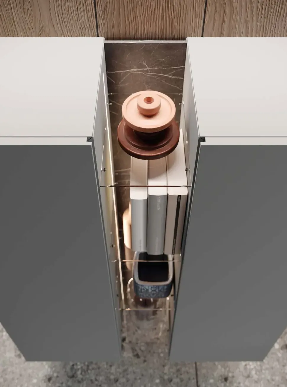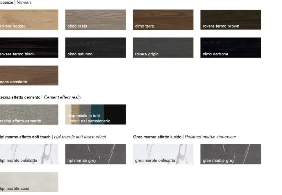 dal legno impiallacciato in essenza naturale alle finiture laccate opache o in Hpl, ogni superficie è pensata per offrire eleganza e durata nel tempo.