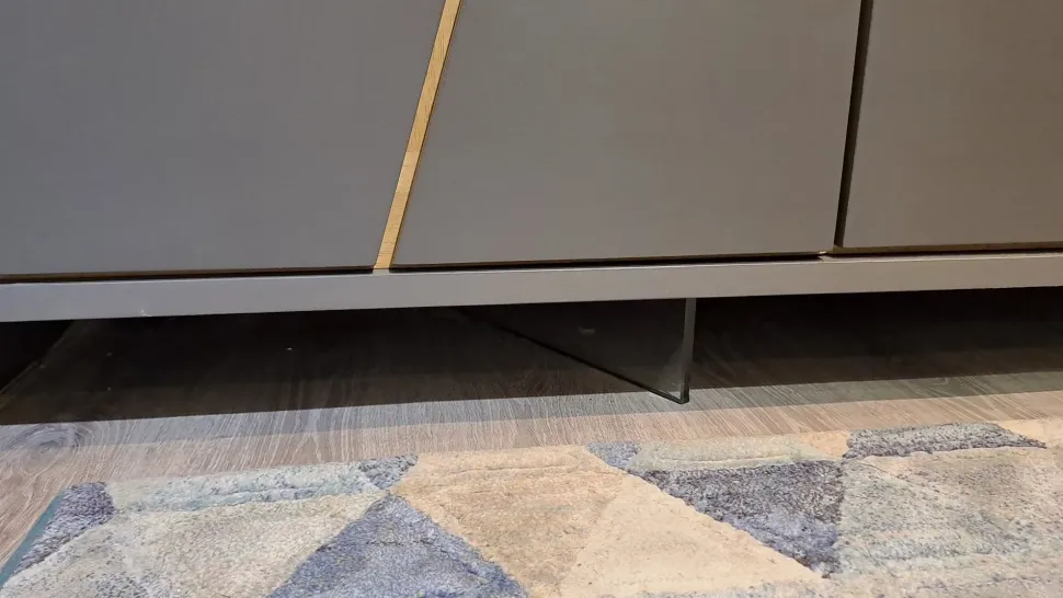 Struttura e frontali in legno massello laccato opaco Antracite; telaio interno e inserti frontali in legno finitura Oak; piedi in vetro.
