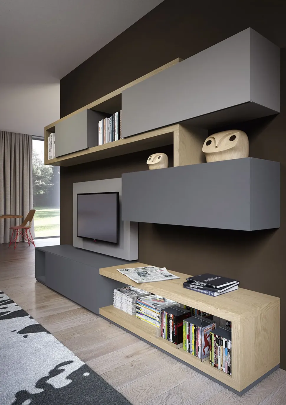 - I mobili e complementi per il living consentono di customizzare lo spazio creando particolari atmosfere: se desideri un soggiorno design, la parete attrezzata nell’immagine è l’ideale.