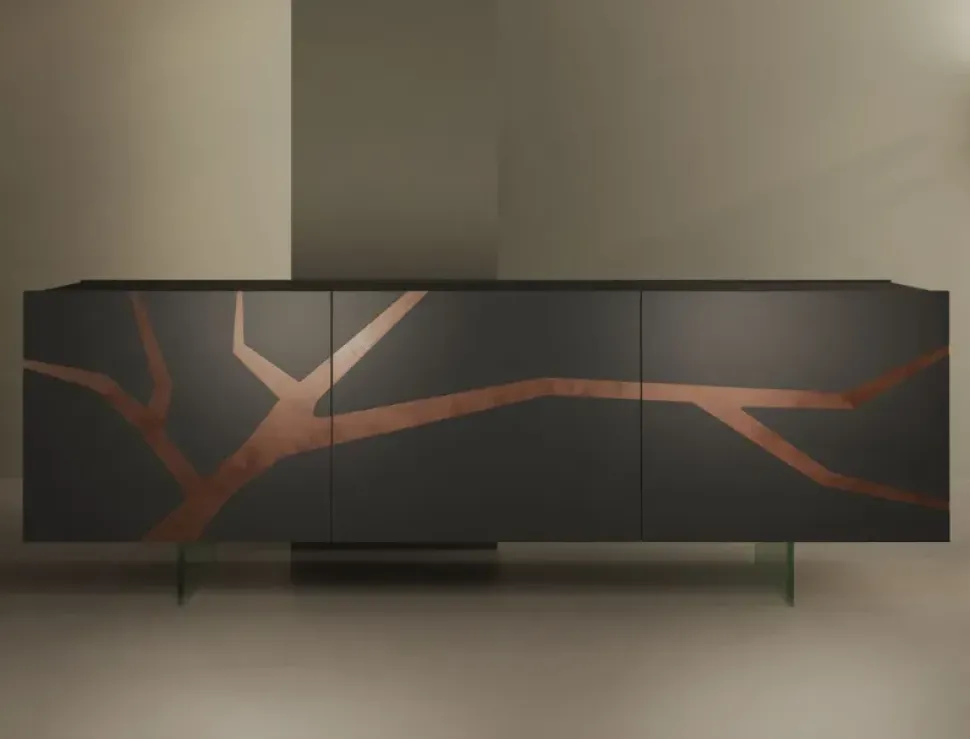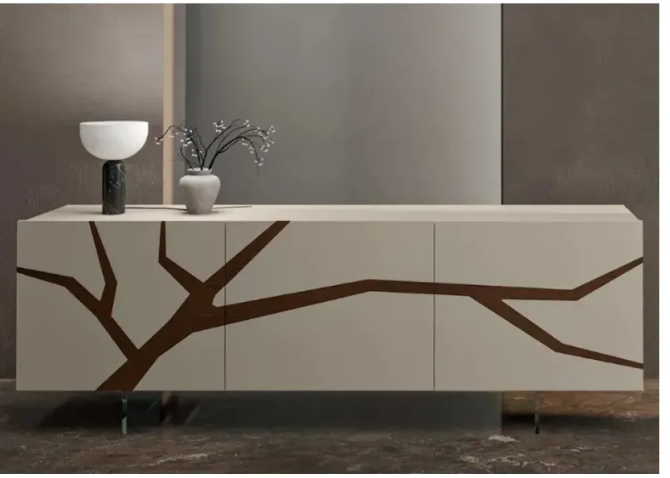 UN SEGNO PRIMARIO, EVOCATIVO E FORTEMENTE ESPRESSIVO, DOVUTO ALLA DECORAZIONE E ALLA LAVORAZIONE DELL’IMMAGINE. IL LEGNO ROVERE SPAZZOLATO SI INTEGRA CON LE SUPERFICI MORBIDE AL TATTO DEL LACCATO. IL TUTTO ALLEGERITO DAL BASAMENTO CON PIEDI IN METALLO O PLEXIGLASS