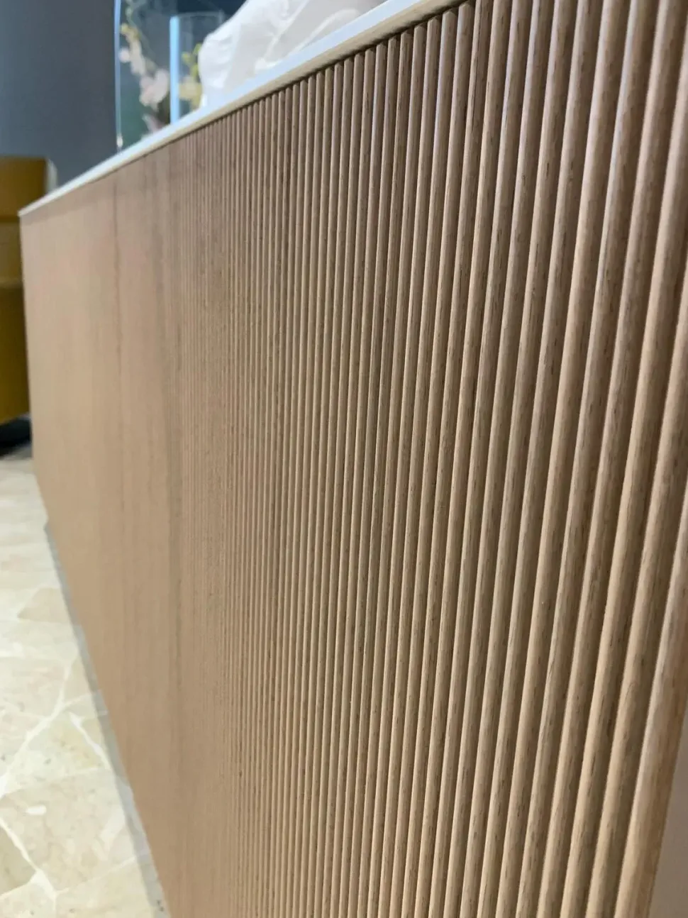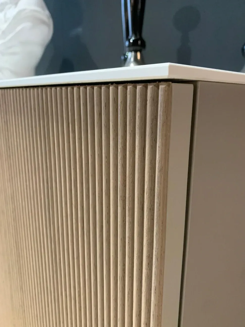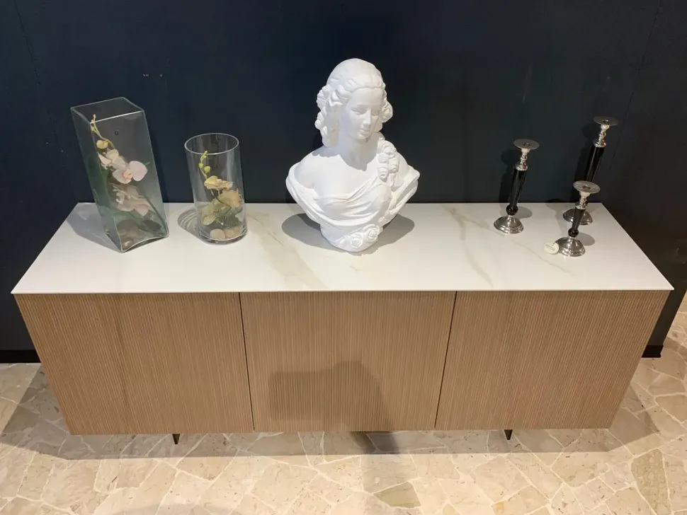 Madia con top in ceramica calacatta oro, ante in cannettato verticale.