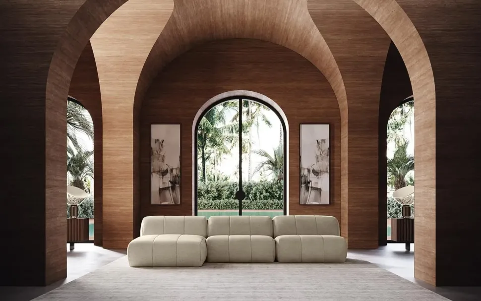 Gli spazi indoor devono essere conformi alle aspettative di chi li frequenta e gli arredi, tra cui anche gli imbottiti, non devono mai risultare ingombranti; il modello qui presente è appartenente alla fascia di imbottiti di lunghezza che va da 326 a 350 cm, risultando così ideale per un ambiente di molteplici volumetrie.