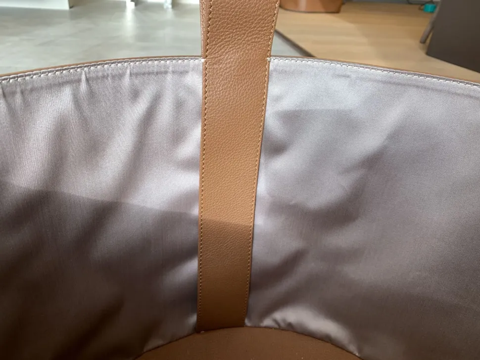 Dimensioni: ø 40 cm ; H 30 cm Cesta realizzata in morbida Pelle Frau SC 67 Chiodi di garofano, lavorata a mano da esperti artigiani. Al corpo della cesta sono cucite maniglie dello stesso rivestimento . La parte interna è rivestita in tela jacquard di poliestere colore beige. Il fondo è in Pelle Frau nella parte superiore a vista e in tela Jacquard Poltrona Frau colore carbone nella parte inferiore. Presenta un bordino perimetrale nero sul fondo che funge da antiscivolo.