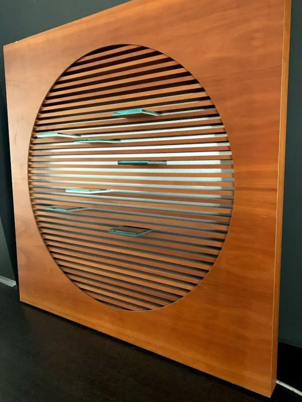 Porta cd/dvd in ciliegio chiaro, da muro si presenta come un pannello di alto spessore nel quale è inscritto un cerchio fessurato longitudinalmente al