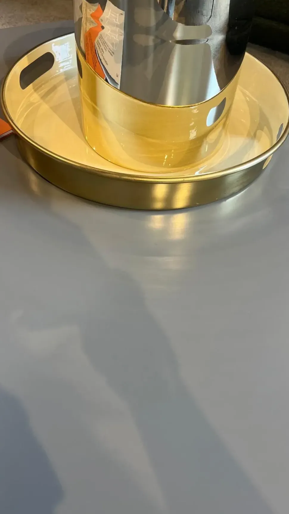 Vassoio tondo con bodi e manici, è color ottone con il fondo smaltato color crema