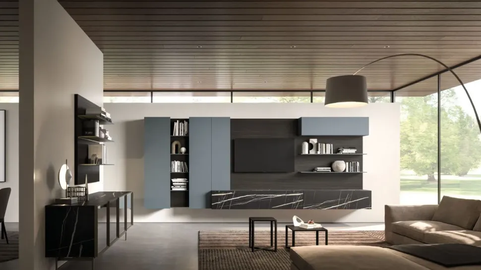 Il soggiorno si compone di vari mobili e complementi capaci di completare lo spazio usufruendo al meglio di ogni angolo; tra questi non mancherà una parete attrezzata come il modello Day 11 di Orme visibile in foto, pensata per dare vita a un soggiorno dinamico e operativo.