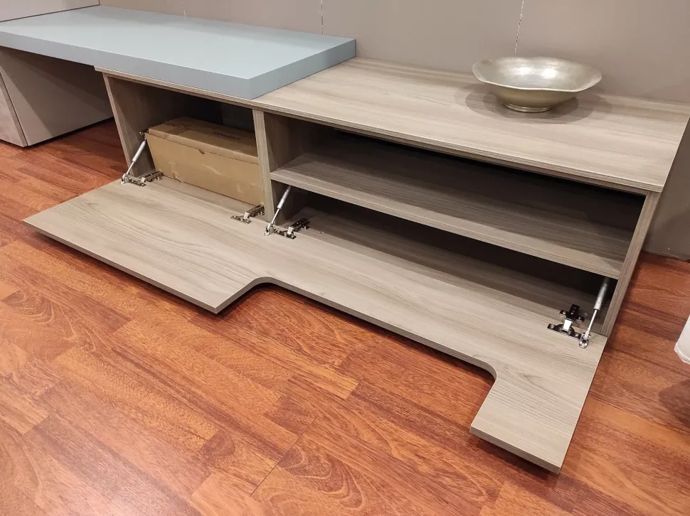 - La soluzione per il soggiorno qui presente è realizzata in materiali durevoli e resistenti nel tempo: questo modello, in particolare, è in laminato opaco.