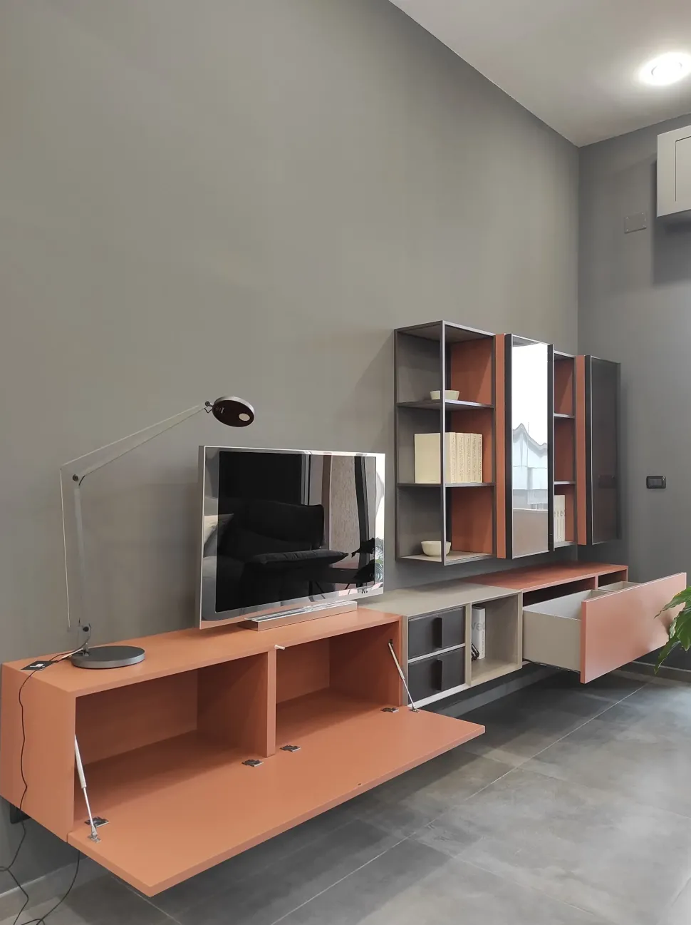 - Se vuoi completare il living con un mobile sospeso, scopri questa parete attrezzata in offerta: saprà rendere lo spazio dinamico e operativo senza risultare ingombranti.