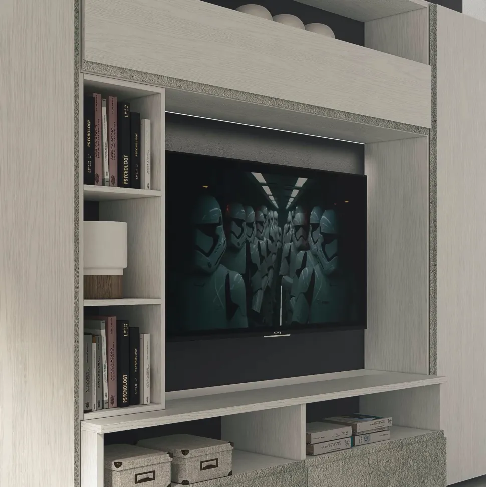 - Nella fotografia è ben visibile il laminato materico con cui questa parete attrezzata è stata costruita: la pluriennale esperienza Collezione esclusiva garantisce materiali sempre resistenti e belli.