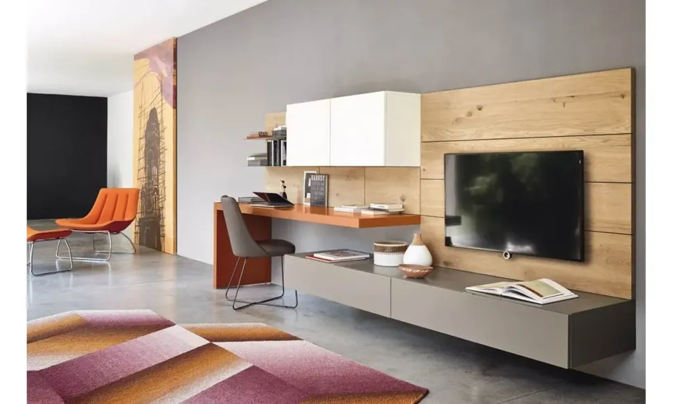 Il living si compone di molteplici mobili e oggetti accessori capaci di completare lo spazio usufruendo al meglio di ogni angolo; tra questi non mancherà una parete attrezzata come il modello Lampo di Sangiacomo presente in foto, studiata per dare vita a un soggiorno pratico e dinamico.
