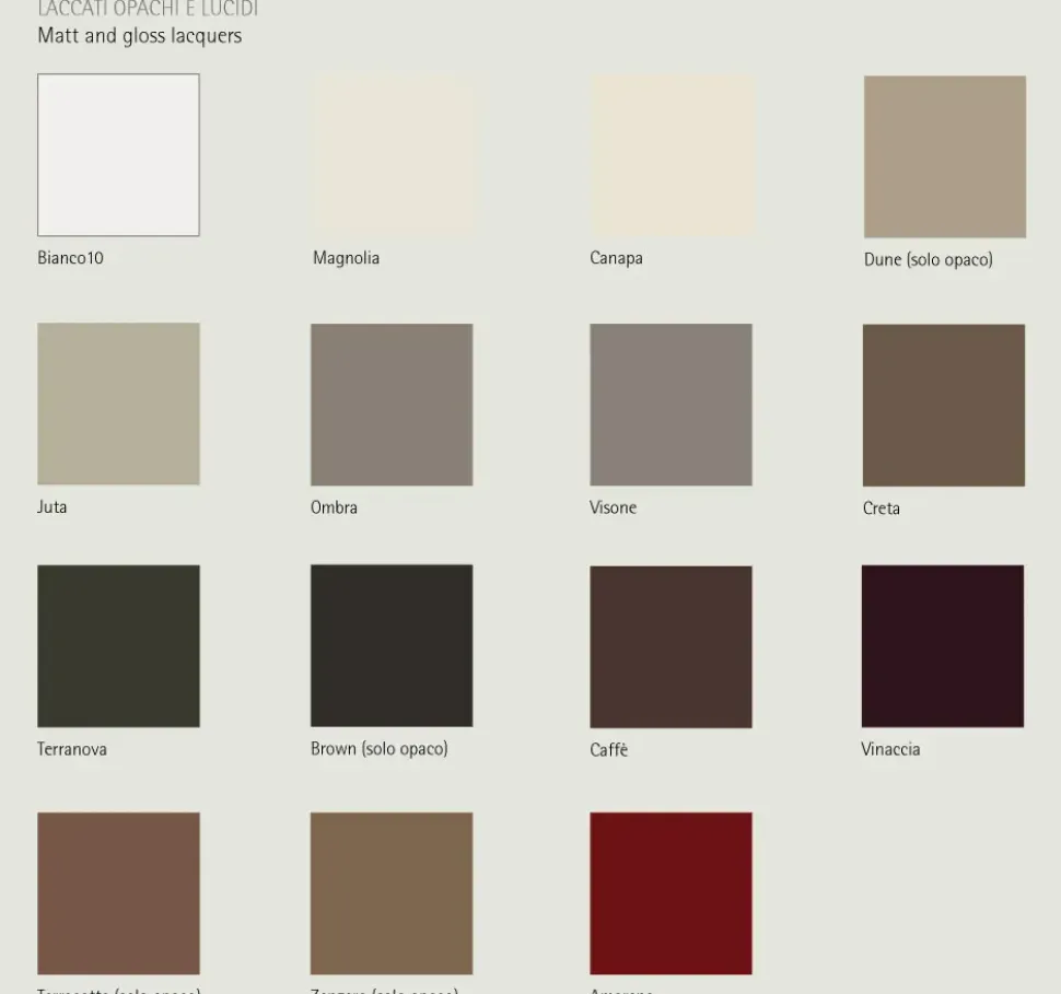 Nella base inferiore i contenitori LAMPO sono laccati Canapa opaco e pianale spessore 60 mm in Canapa opaco.