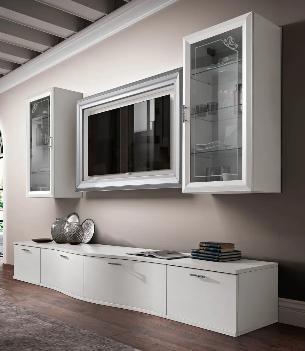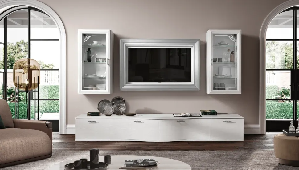 Il mobile soggiorno descritto è una soluzione completa e versatile per l’organizzazione dello spazio e l’esposizione di oggetti decorativi. Alla base, troviamo quattro cassettiere, di cui due leggermente più grandi rispetto alle altre due, offrendo così una varietà di spazio di archiviazione per adattarsi a diversi tipi di oggetti domestici. Queste cassettiere forniscono un’organizzazione efficiente per mantenere gli articoli ordinati e facilmente accessibili. Sopra le cassettiere, ci sono due vetrine laterali con mensole interne in vetro. Queste vetrine aggiungono un tocco di eleganza e offrono uno spazio espositivo ideale per esporre oggetti decorativi, collezioni o articoli di valore. I ripiani interni in vetro consentono una visibilità chiara degli oggetti esposti, permettendo loro di brillare attraverso le ante in vetro. Zona centrale con cornice di stile argentata porta tv. Mobile in finitura argento e bianco frassino come in foto. Personalizzazione delle finiture senza variazione di prezzo. Ha una lunghezza di 300cm, Altezza 195cm, Profondità 60cm. Consegna compresa nel prezzo, 30-40 giorni lavorativi. La nostra offerta per questo mobile living è di euro 2500,00. Per maggiori informazioni contattaci via mail o passa nel nostro showroom.