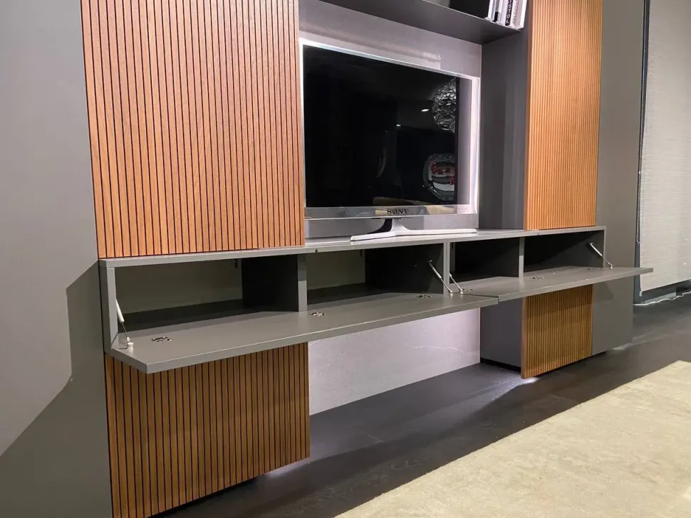 Schienali in nobilitato piasentina con mensole in metallo; Ante colonne e contenitori a ribalta col. piombo nobilitato liscio e groove col. noce naturale (030g); interni con mensole in vetro; luci LED incluse