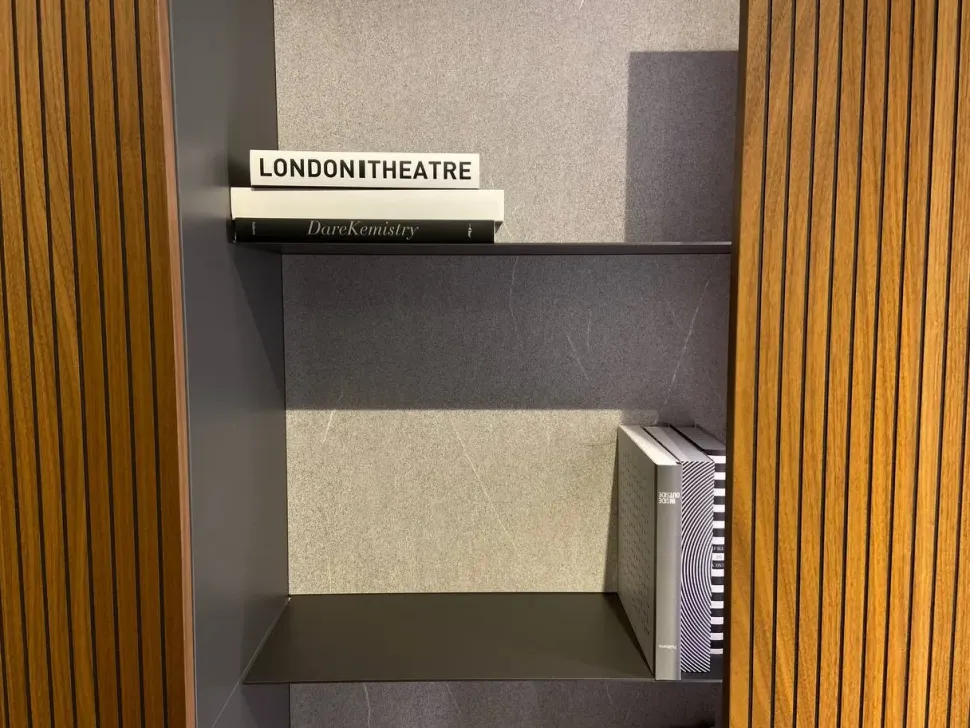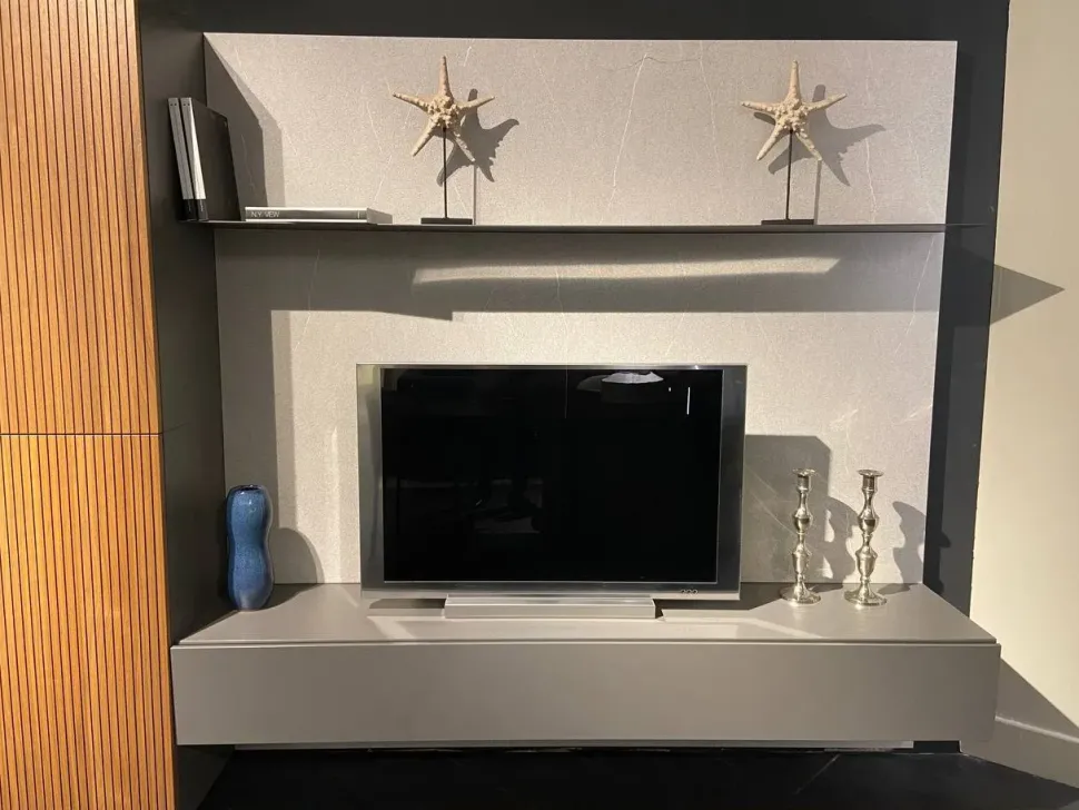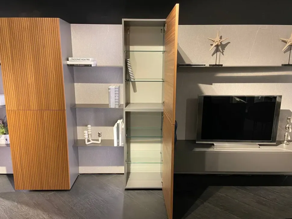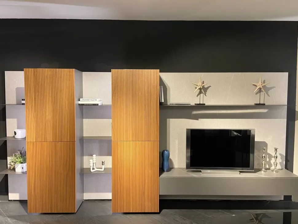 Schienali in finitura col. piasentina con mensole in metallo; Colonne con struttura col. piombo liscio e frontali in groove col. noce naturale (030g); contenitore a ribalta sotto TV col. piombo liscio; interni con mensole in vetro; luci LED incluse