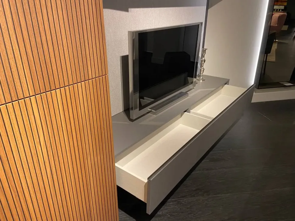 Tra diversi mobili e complementi senza maniglia, questa proposta saprà arricchire il living sfruttando bene ogni angolo.
