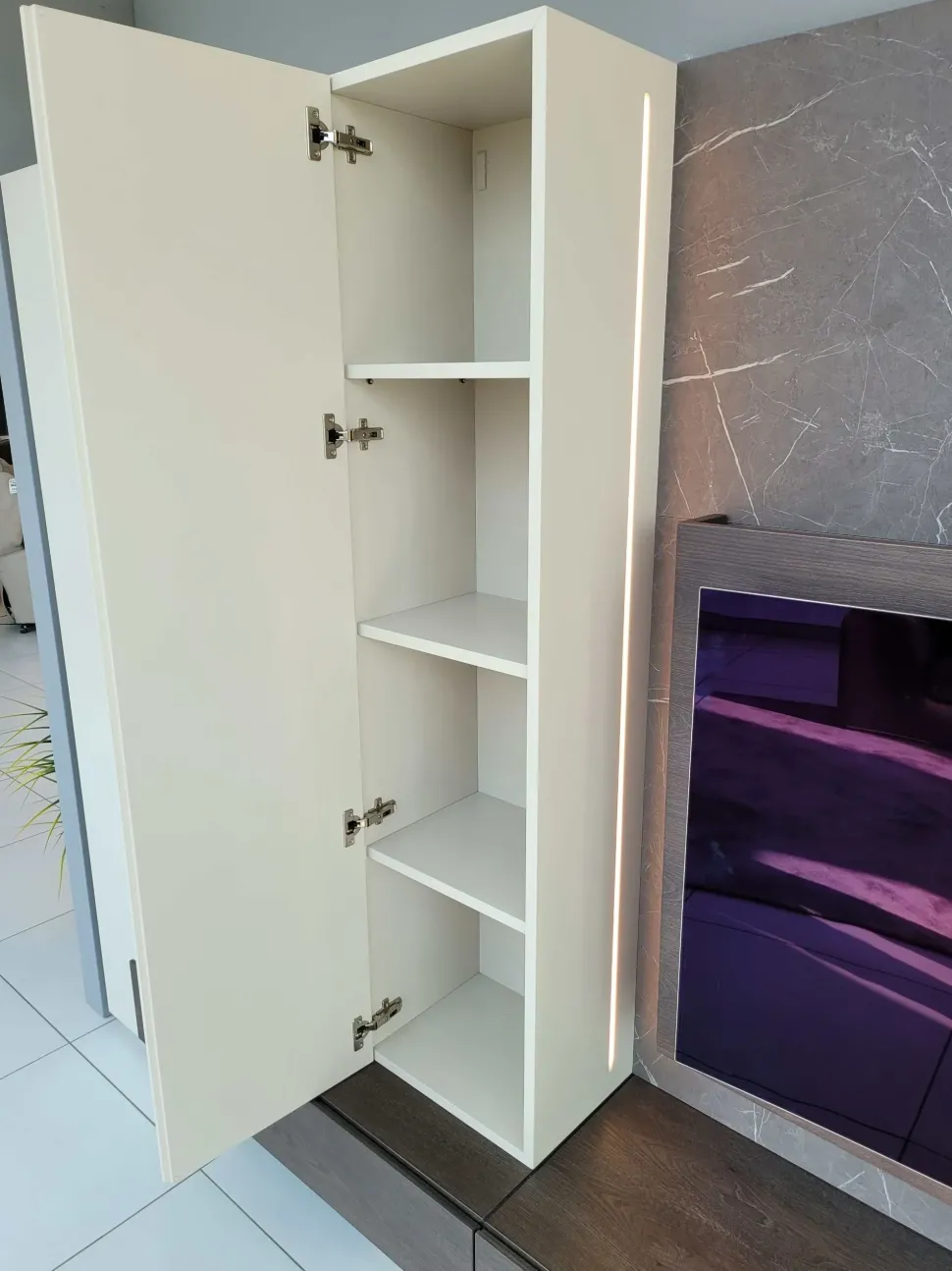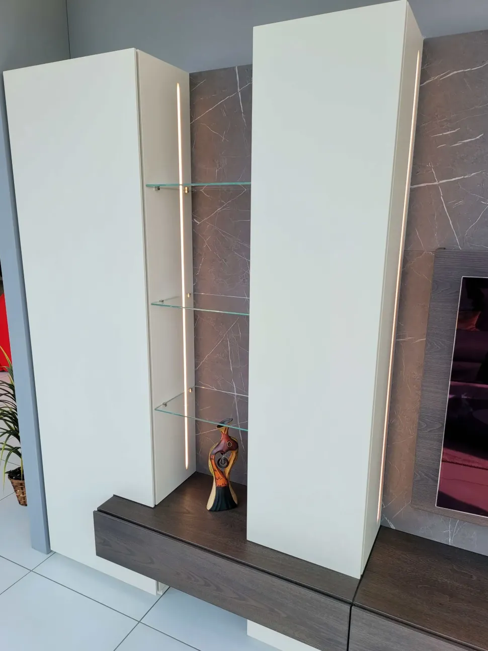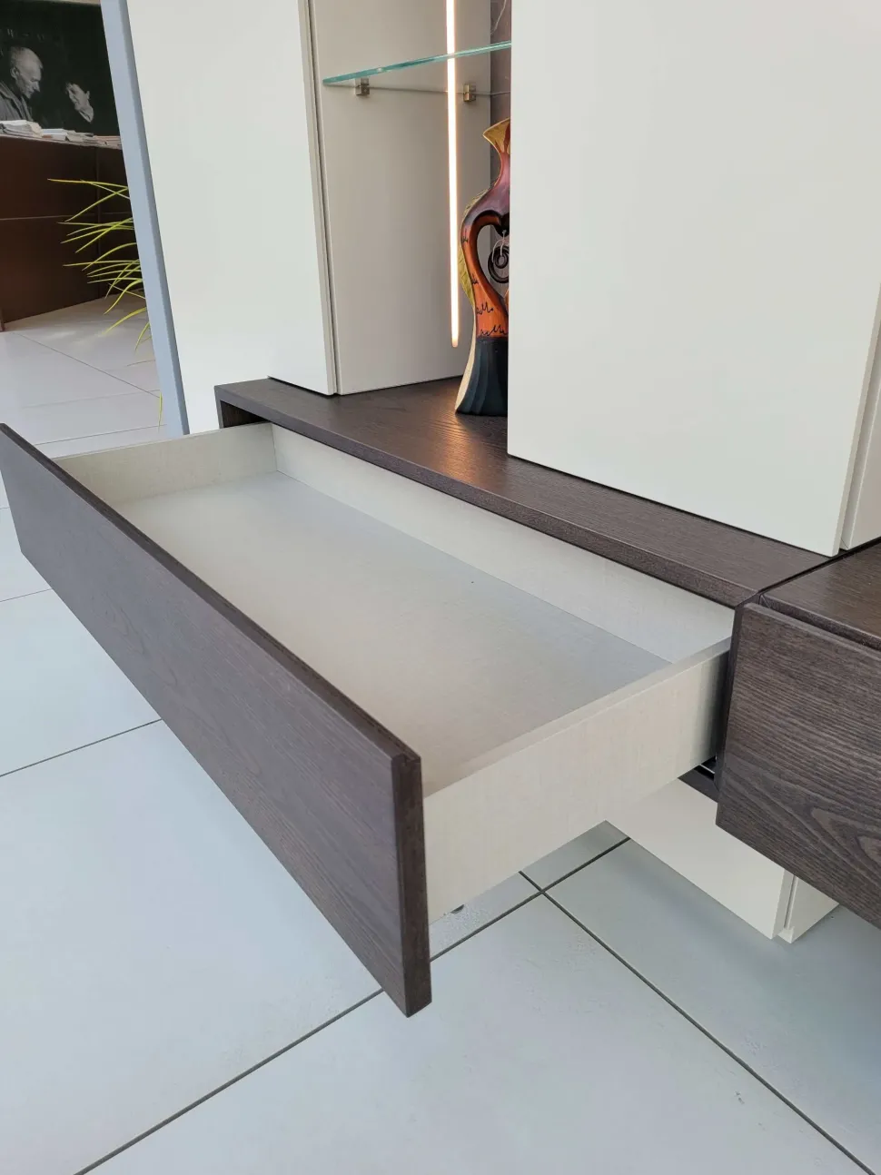 Sono presenti tre elementi a terra con anta a battente e ripiani interni in vetro trasparente, molto comodi per riporre l’occorrente per la tavola o qualsiasi altro oggetto. Sono in laccato opaco colore CAPPUCCINO, colore che si sposa alla perfezione con la finitura essenza Olmo Autunno dei due cassetti sospesi presenti in basso. Ulteriore valore aggiunto alla composizione la danno le barre a LED incassate sui fianchi degli elementi con anta che illuminano lo schienale in HPL finitura marmo grigio.