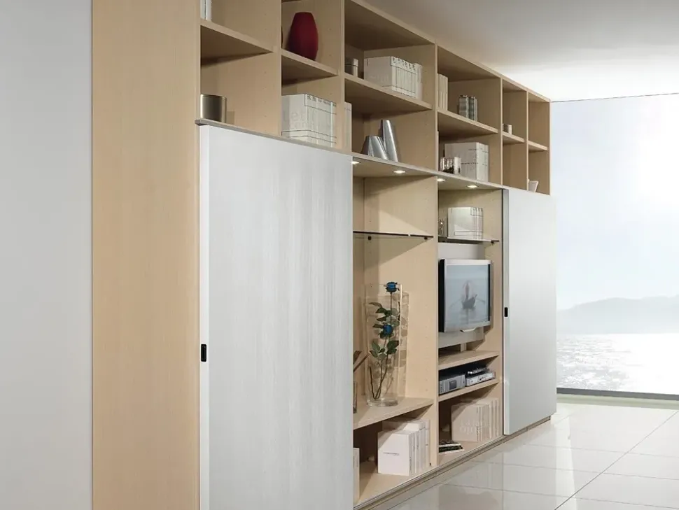 Se vuoi completare la zona giorno con una parete attrezzata senza maniglia, il modello Parete-attrezzata mod.delo in tamburato scontata del 30% presente in foto fa al caso tuo.