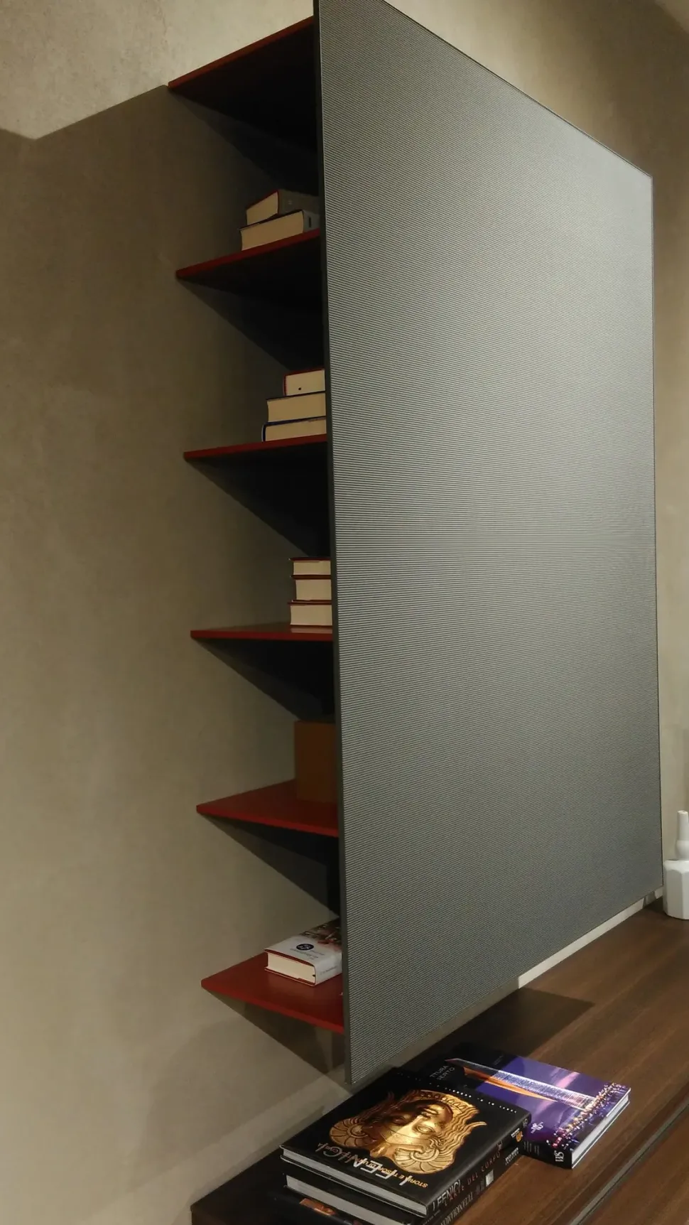 La libreria pensile Password di Molteni&C, con anta scorrevole in vetro rigato 3D colore antracite, ha i ripiani rosso rubino e la spalla interna a specchio. Si accede frontalmente alla libreria da entrambi i lati. Può essere caricata per un massimo di 75 kg, uniformemente distribuiti. Dimensioni: larghezza 110 cm – altezza 154,2 cm – profondità 36,2 cm. La libreria necessita di uno spazio complessivo in larghezza di 190,2 cm. la proposta non include il mobile sotto la libreria pensile.