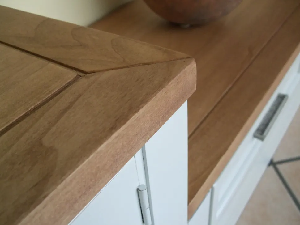 Finitura bianca, laccata invecchiata con battuta spigolata; maniglie in finitura argento anticato; top in finitura oliato naturale.