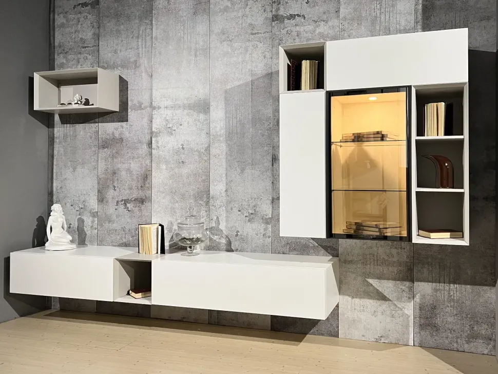 Colori moduli a giorno laccati opachi seta, moduli ad ante meterico bianco opaco e modulo vetrina con vetro riflettente bronzato.