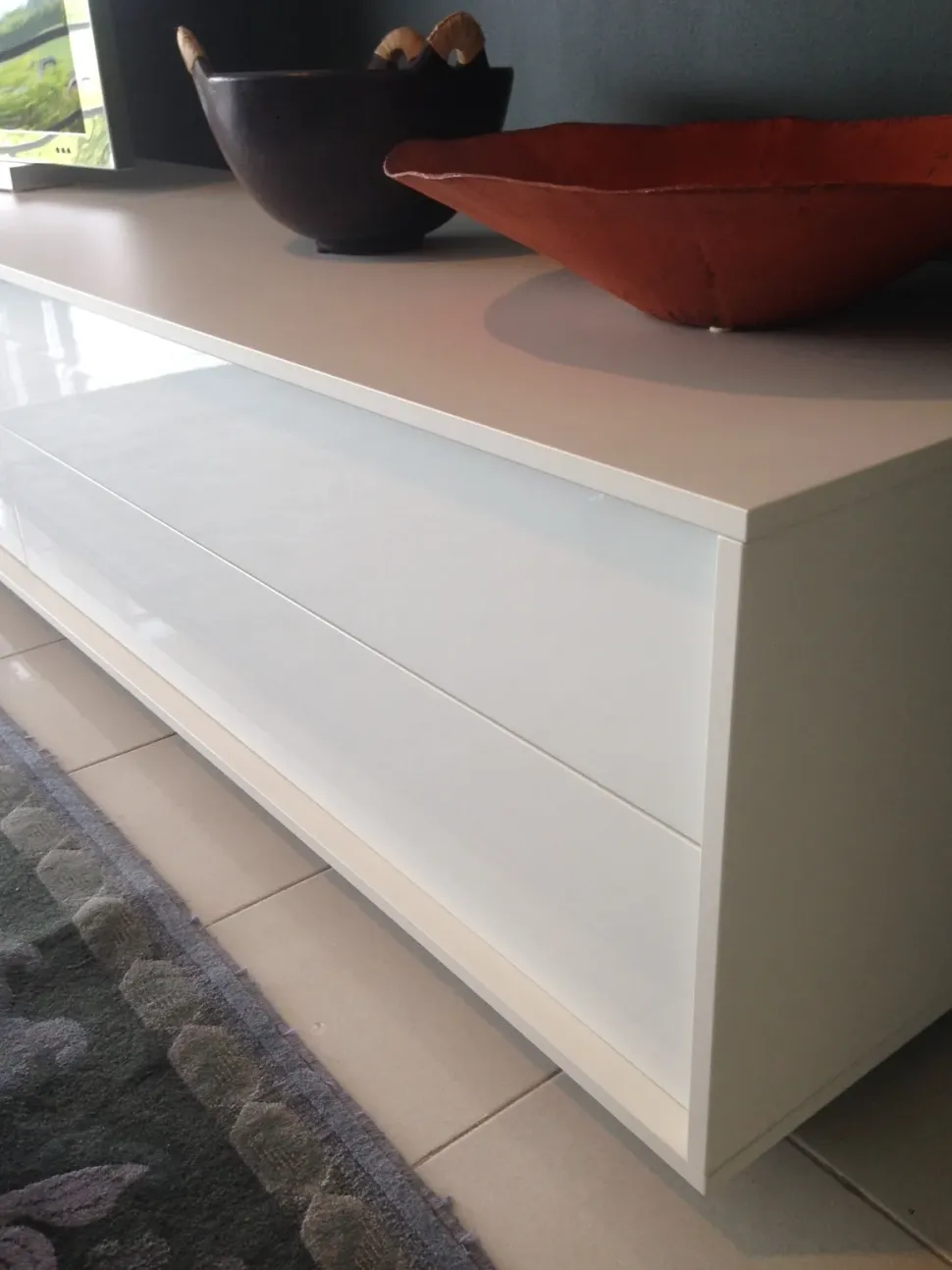 Il pensile è lungo cm 180 ed ha l’anta in vetro acidato montata su telaio in alluminio. Sotto il pensile è montata una mensola lucida con pannello opaco.