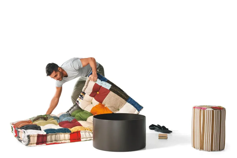 Si tratta di un materasso avvolto a cono e infilato dentro a una piccola base cilindrica che crea una poltrona letto con morbidi braccioli.