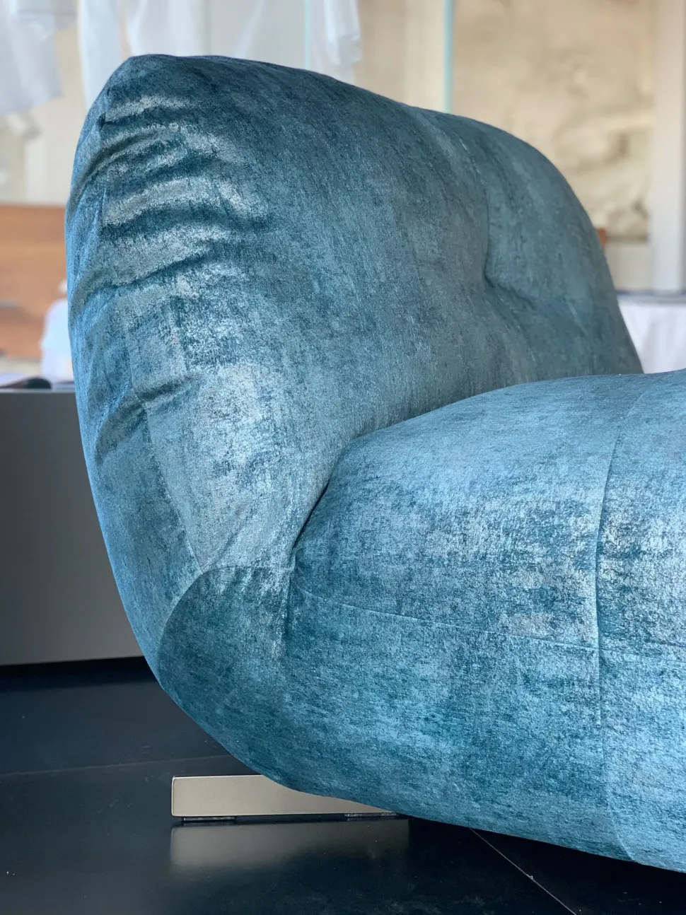 Happening è la nuova poltrona firmata Lago, in questa versione è presentata senza braccioli, e con tessuto Frosty con effetto metallizzato.